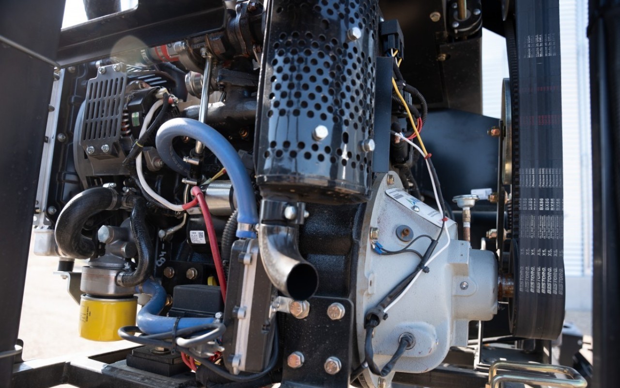 Overhauled engine mount. Moved to a more accessible location, the hydraulic tank and filter are easier to service. Other changes include smoother hydraulic flow and an EZ oil drain for less mess, hassle, and downtime during oil changes.
