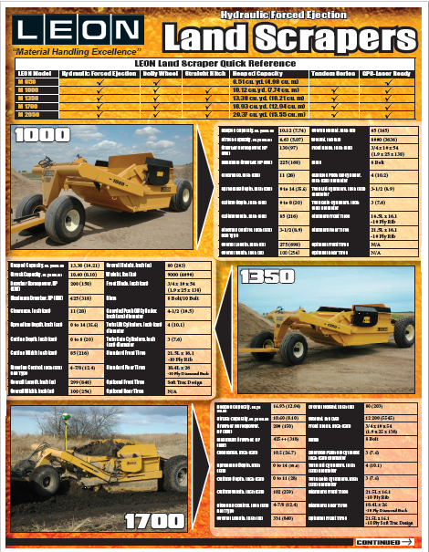 Leon Landscrapers are known for the highest standard in quality, design in durability. With over 60 years experience manufacturing heavy handling equipment makes the Leon a reliable choice for all your scraping needs. These heavy-duty trouble free scrapers can be used for landscaping, to build roads or dikes, and can turn any unuseable acreage into a profit producing farm.