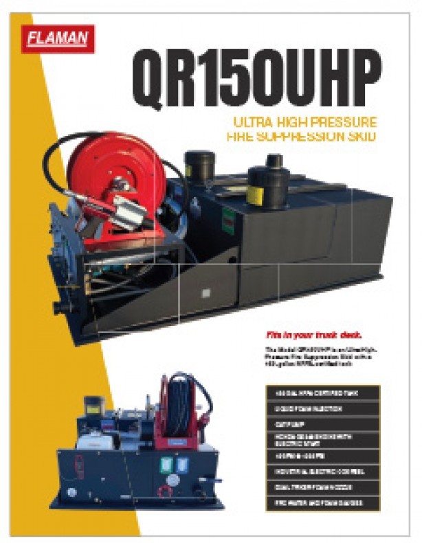 The Model QR150UHP is an Ultra High-Pressure Fire Suppression Skid with a 150-gallon NFPA-certified tank.